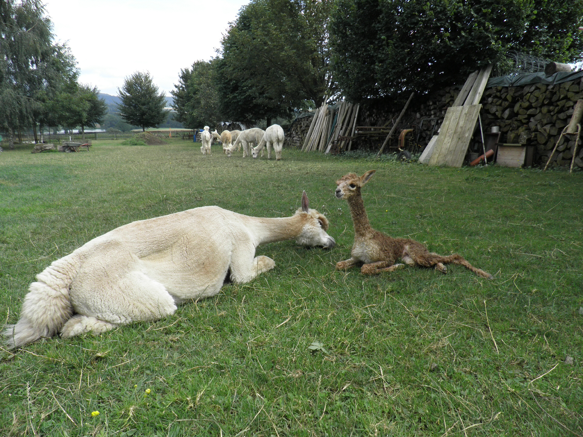 Ist jedoch der ganze Stress erst einmal vorbei, nimmt sich die Alpakastute erst einmal Zeit für Ihr Fohlen