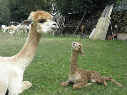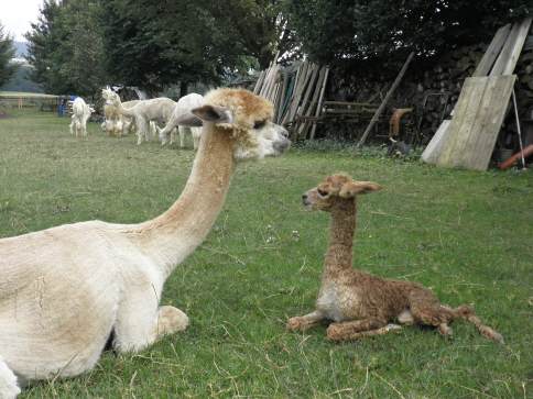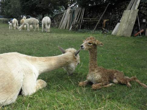 (Das Alpakas überhaupt nicht lecken können, so wie viele behaupten, ist falsch. Man kann liebevollen Müttern öfters zusehen wie sie ihre Schützlinge ablecken.)