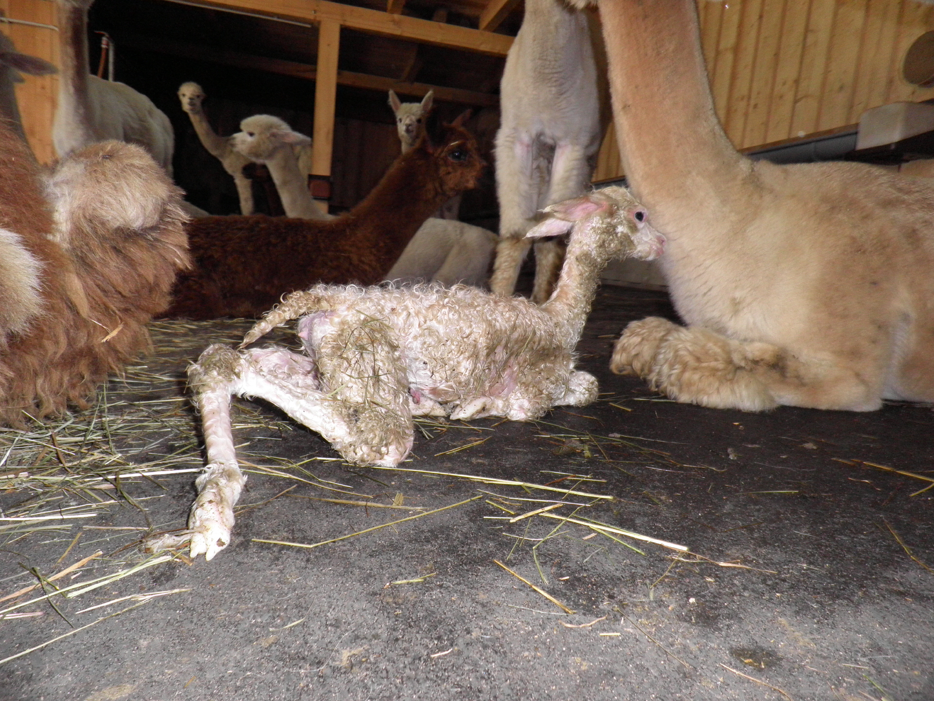 Das Alpakafohlen sieht so auf den ersten Blick meistens recht leblos aus.