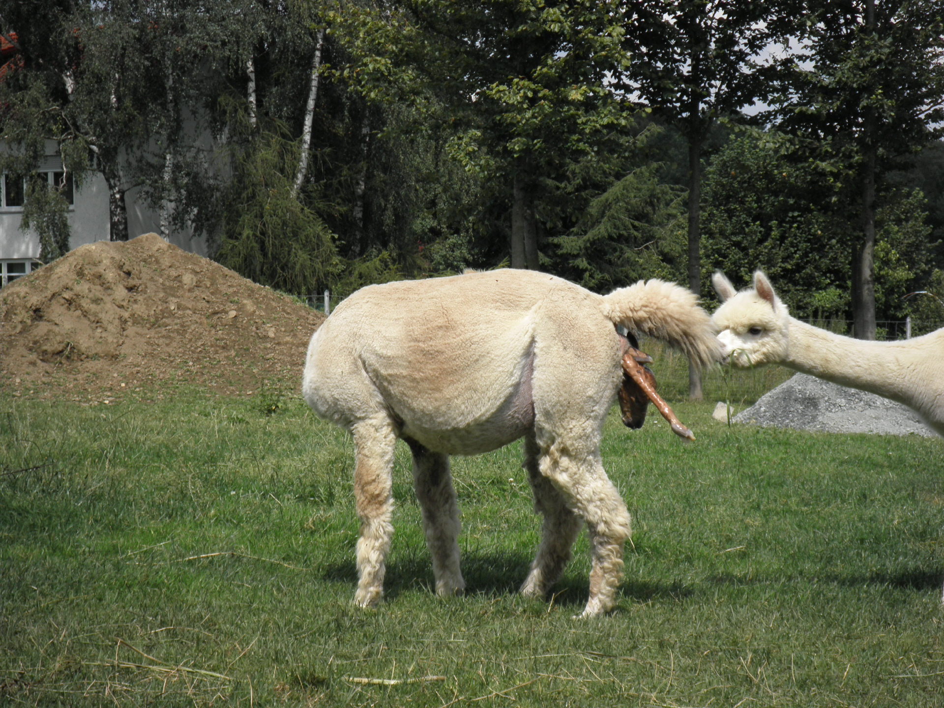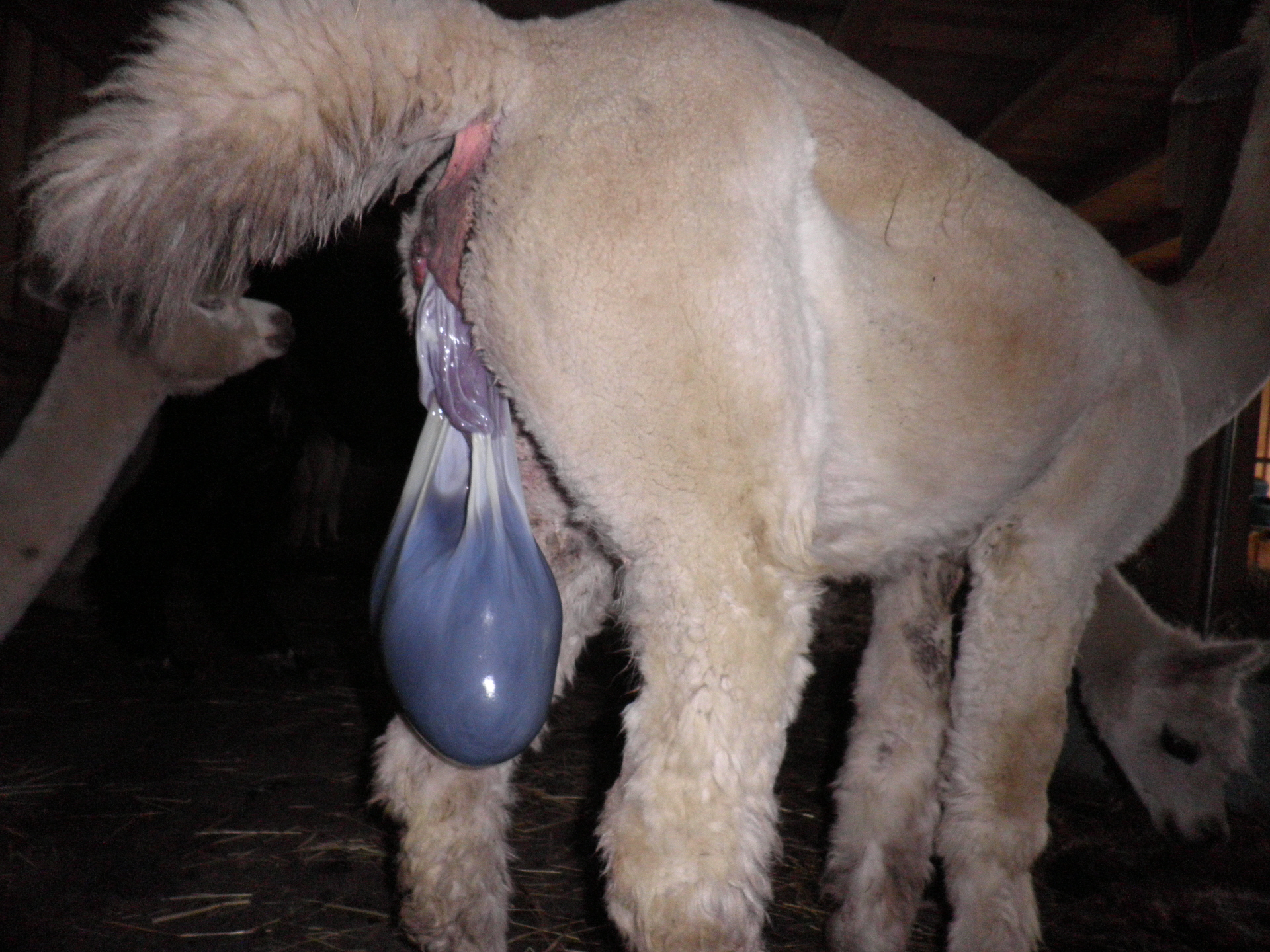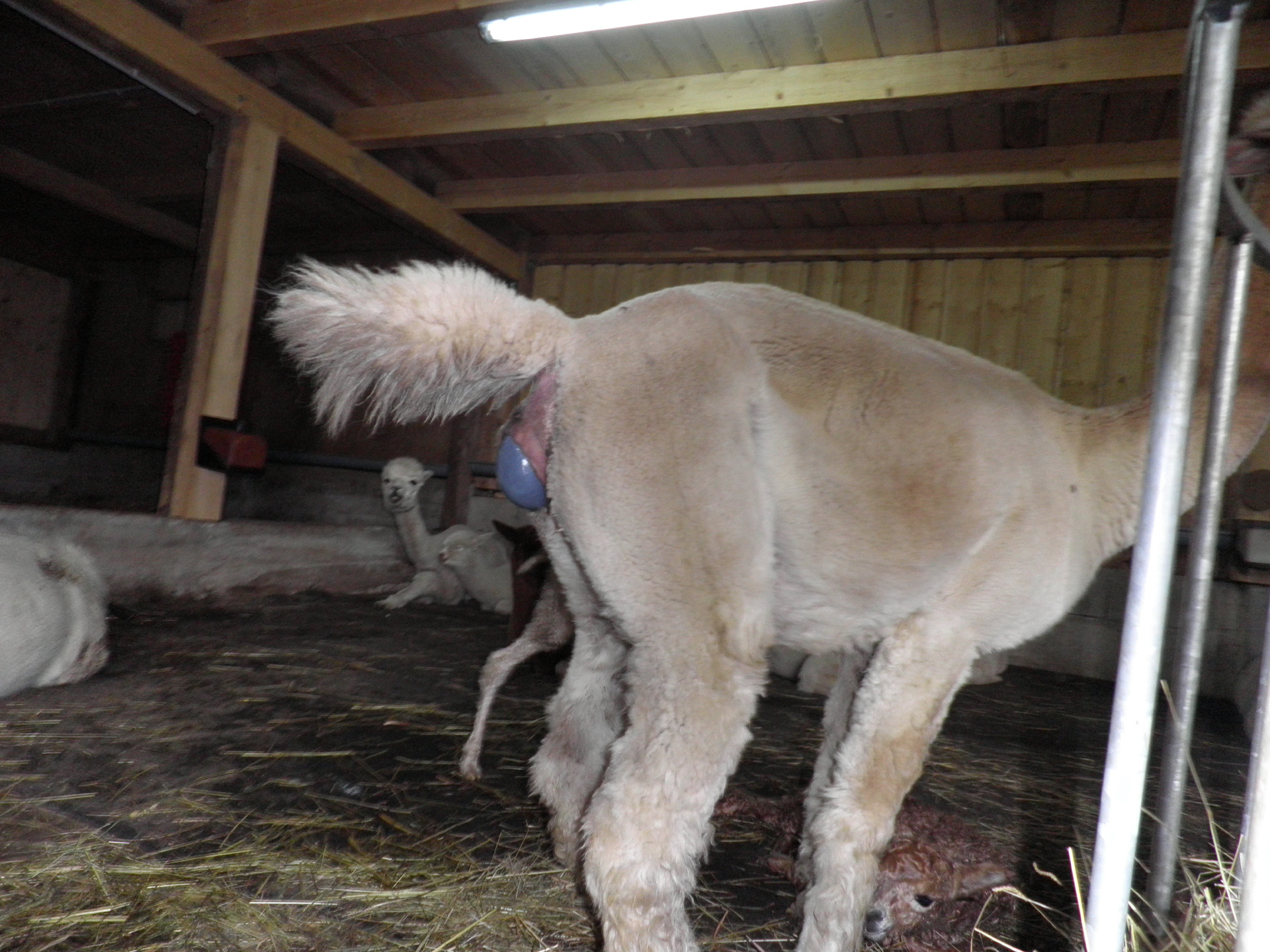 Die Nachgeburt schaut jetzt leicht heraus. Die Alpakastute presst stark. Es kommt oft vor, das sie sich ein paar Mal wieder zurückziet bis sie endlich ganzheraussen ist.