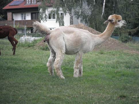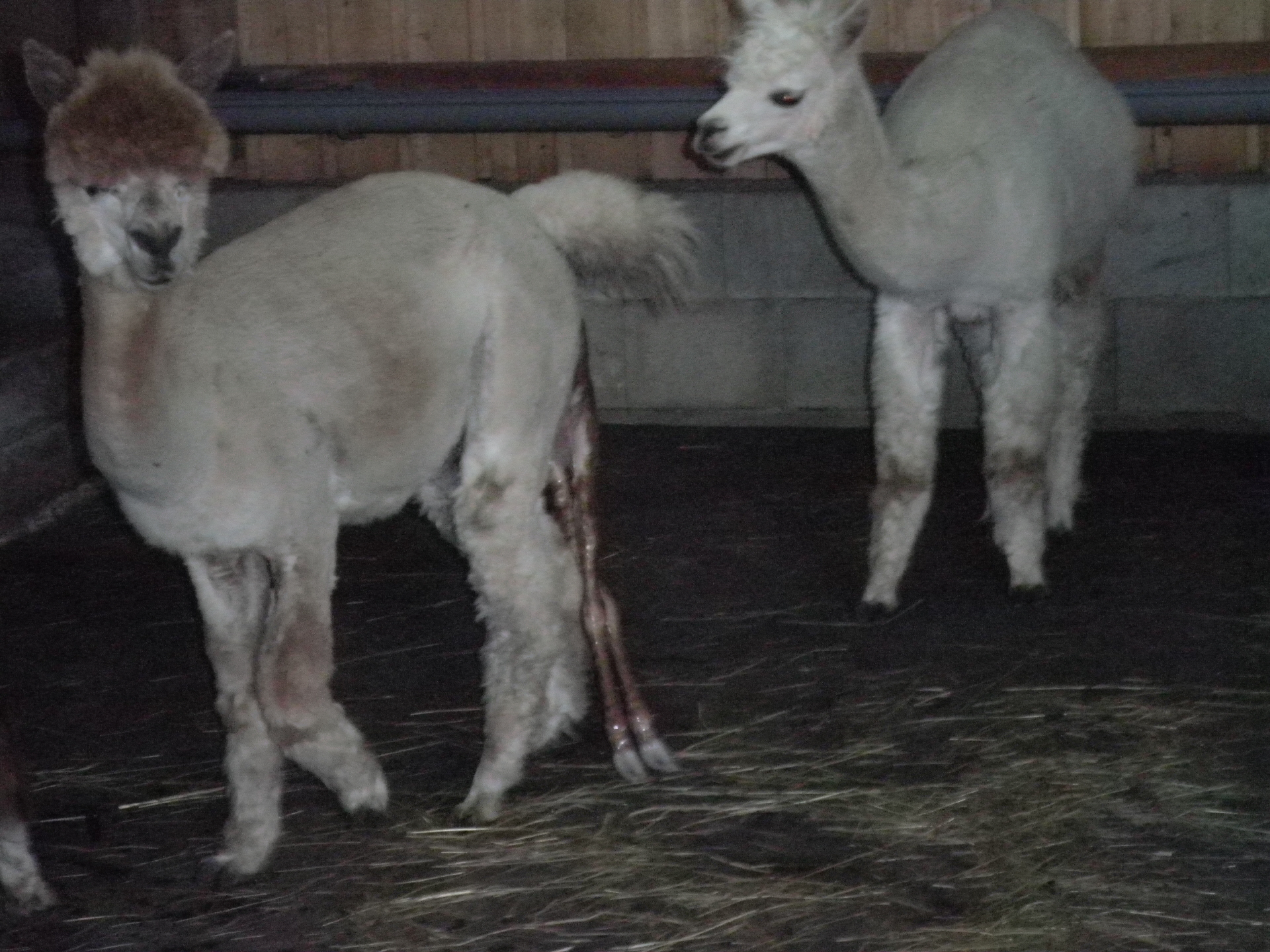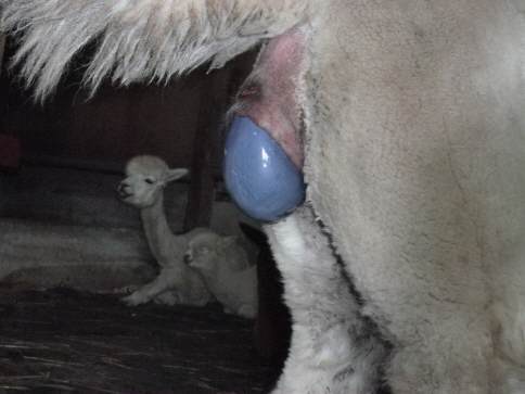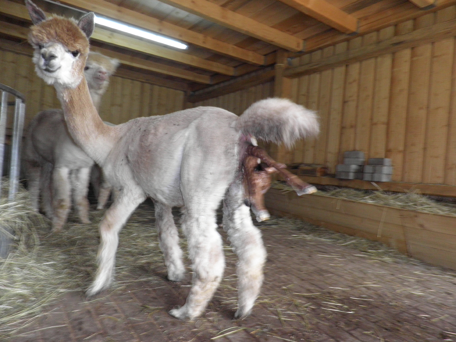 Die Nachgeburt schaut jetzt leicht heraus. Die Alpakastute presst stark. Es kommt oft vor, das sie sich ein paar Mal wieder zurückziet bis sie endlich ganzheraussen ist.
