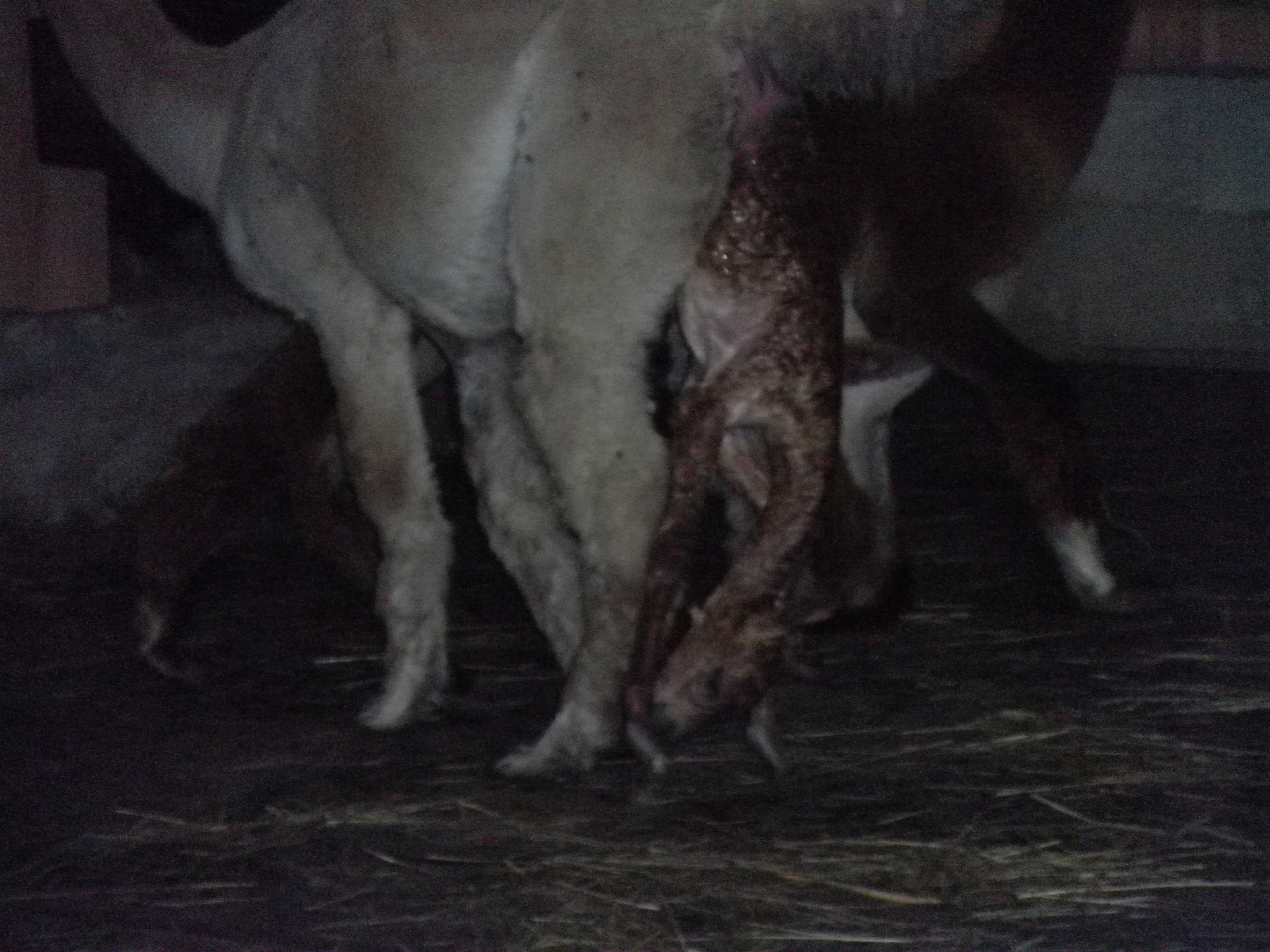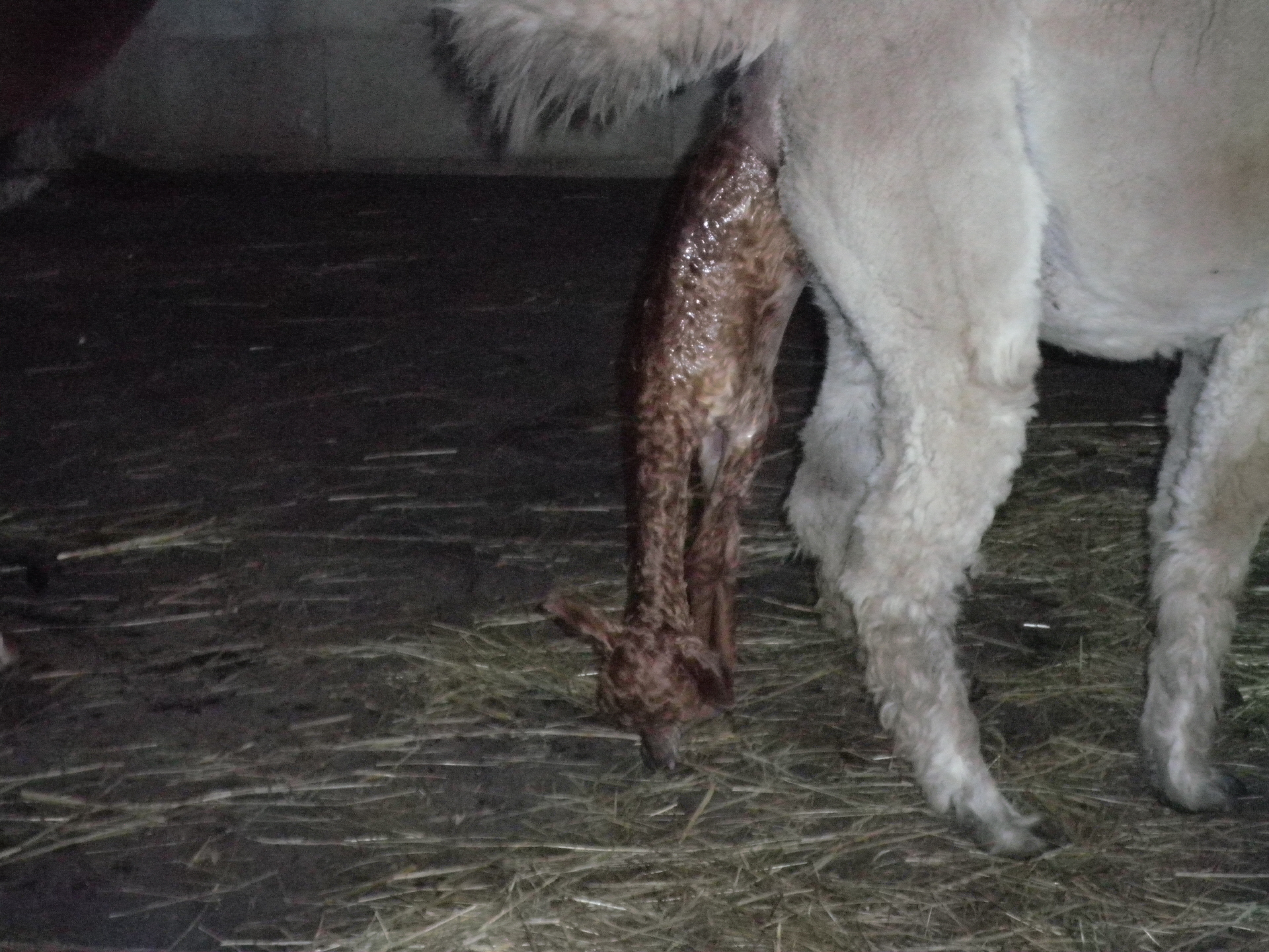 Die Füße des Alpaka Crias kommen zum Vorschein. Oft erst ein Fuß, wie auch hier auf dem Bild. Dies ist kein Grund zur Panik, der zweite folgt gleich. Erst wenn schon der Großteil des Halses herausen wäre und der zweite Fuß immer noch nicht sichtbar wäre, bräuchte die Stute die Hilfe des Menschen.