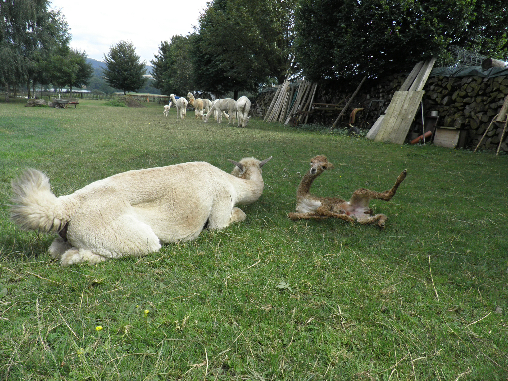 Dieses Verhalten / Instinkt kommt vermutlich daher, dass die Zunge der Alpakas zu kurz ist um ihre Fohlen trocken zu lecken.