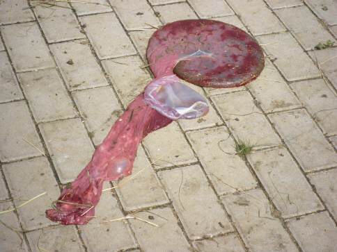 Die Nachgeburt ist nun heraussen und hängt nach unten. Die Nachgeburt darf nicht von Hand weiter herausgezogen werden. Es kann oft mehrere Minuten dauern, aber irgendwann fällt sie zu Boden.
